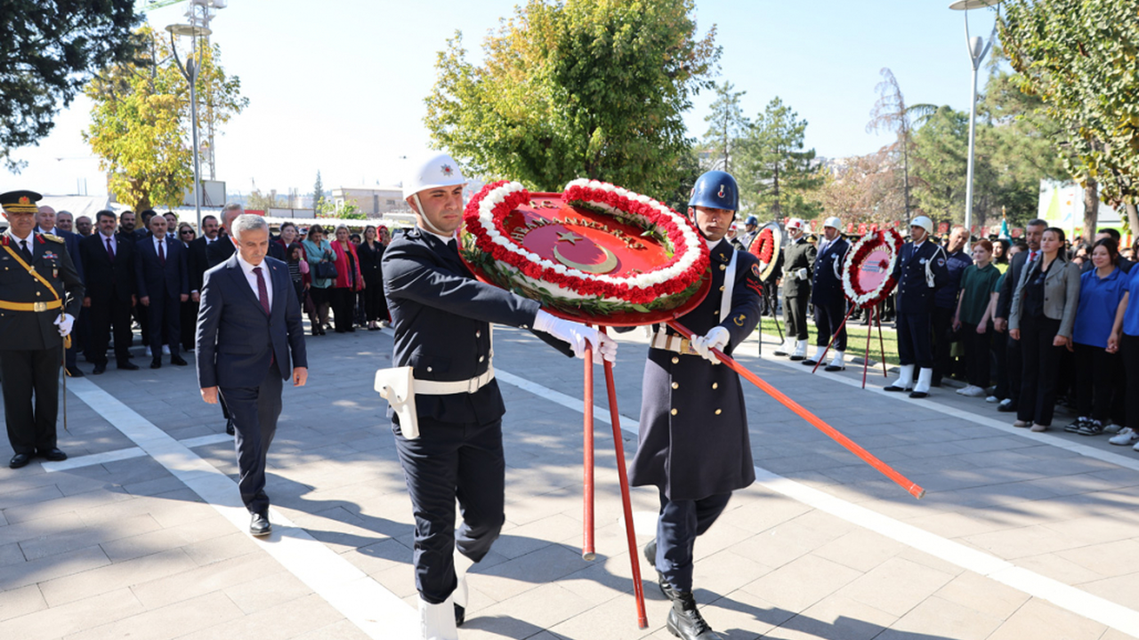 Atatürk Anıtı’na Vali Mükerrem Ünlüer, 2. Ordu İdari Kurmay Yarbaşkanı Tuğgeneral Mustafa Er ve Büyükşehir Belediye Başkanı Fırat Görgel tarafından çelenk sunulmasıyla başlayan etkinlikler, Valilik önünde düzenlenen törenle devam etti.