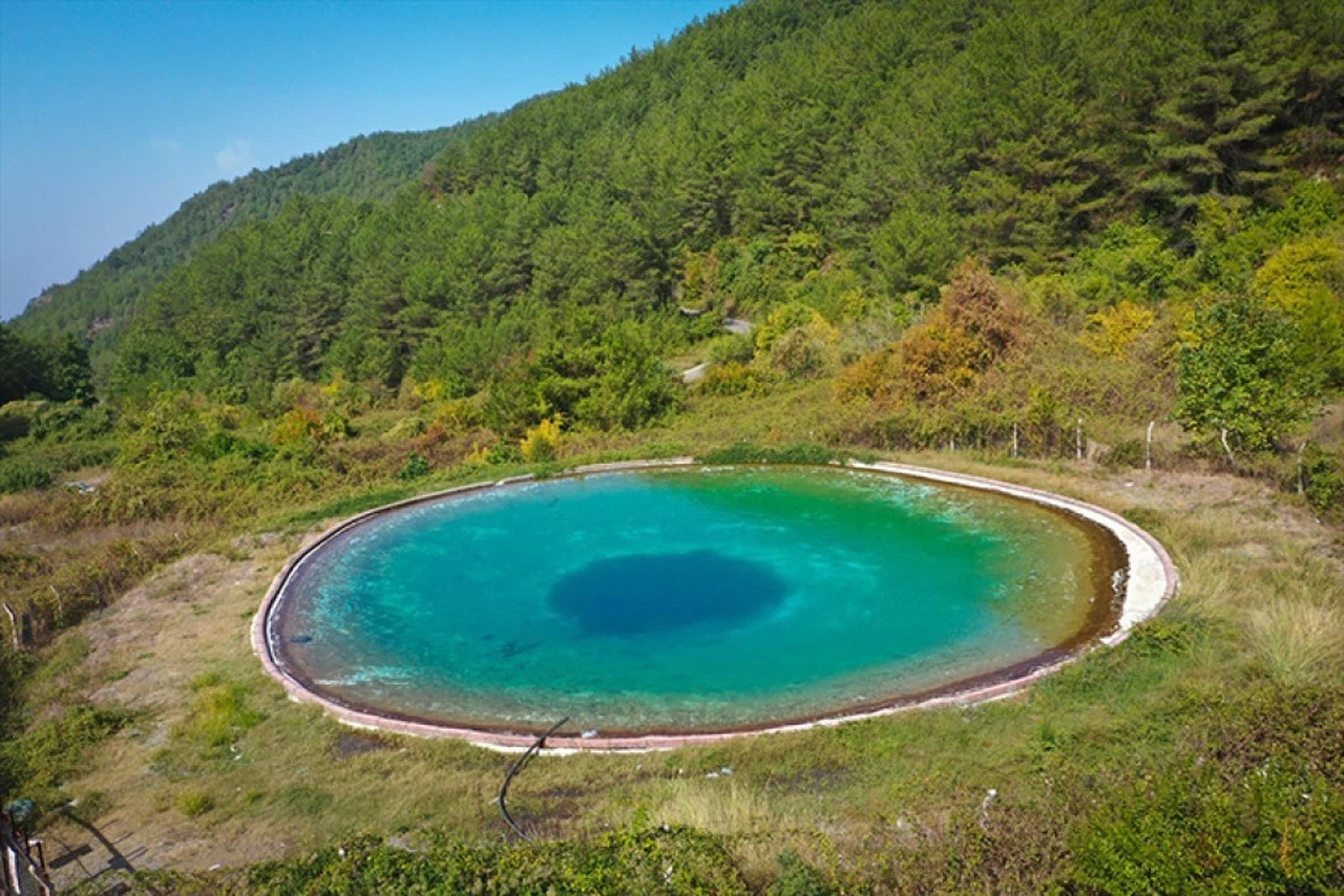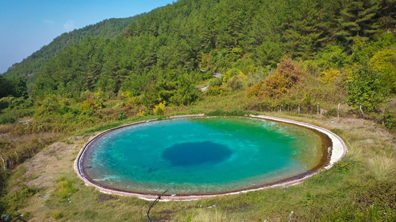 Hatay'da, Amanos Dağlarında bulunan ve kuş bakışıyla nazar boncuğunu andıran yangın göleti, görenlerin ilgisini çekiyor.
