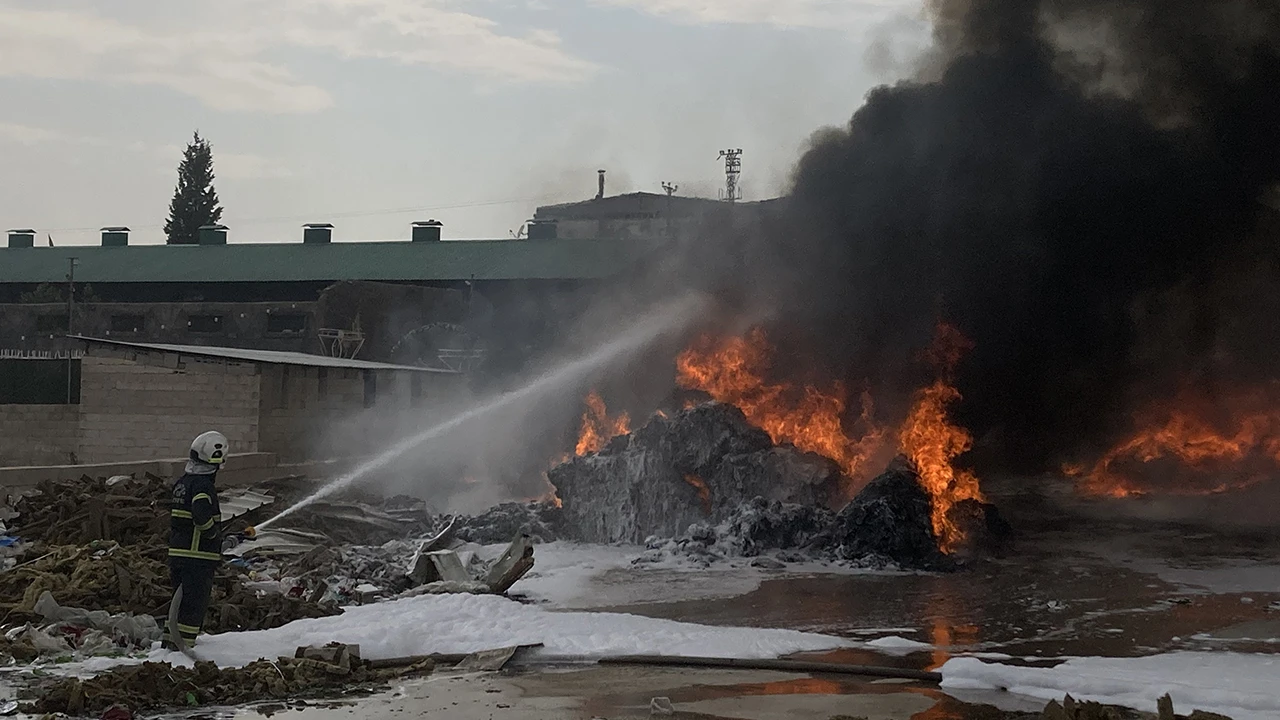 Gaziantep'in merkez Şehitkamil ilçesinde, geri dönüşüm tesisinde çıkan yangına itfaiye ekipleri müdahale ediyor.