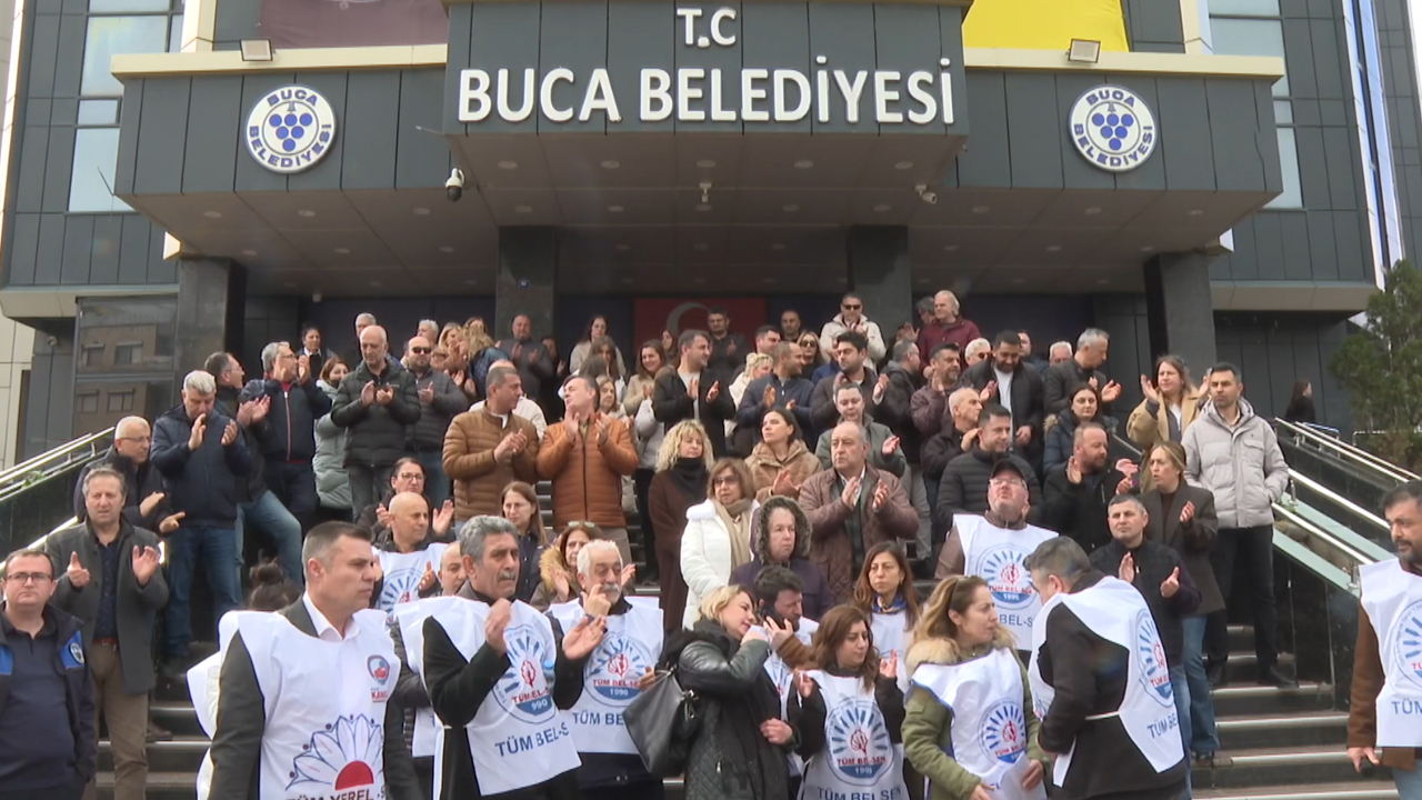 Buca Belediyesi önünde toplanan memurlar adına basın açıklaması yapan Tüm Bel-Sen İzmir 2 No'lu Şube İdari Sekreteri Nurcan Hükenek, alacakları için 3 gündür eylem yaptıklarını belirtti.