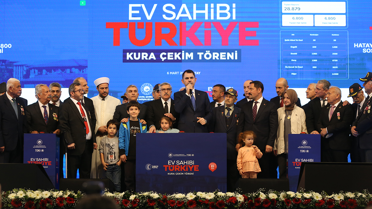 Bakan Kurum, Hatay Mustafa Kemal Üniversitesi (HMKÜ) Kapalı Spor Salonu'nda "Yüzyılın Konut Projesi 500 Bin Sosyal Konut" kapsamında düzenlenen "Ev Sahibi Türkiye Kura Çekim Töreni"nde yaptığı konuşmada, asrın felaketinde hayatını kaybeden tüm şehitlere Allah'tan rahmet diledi.