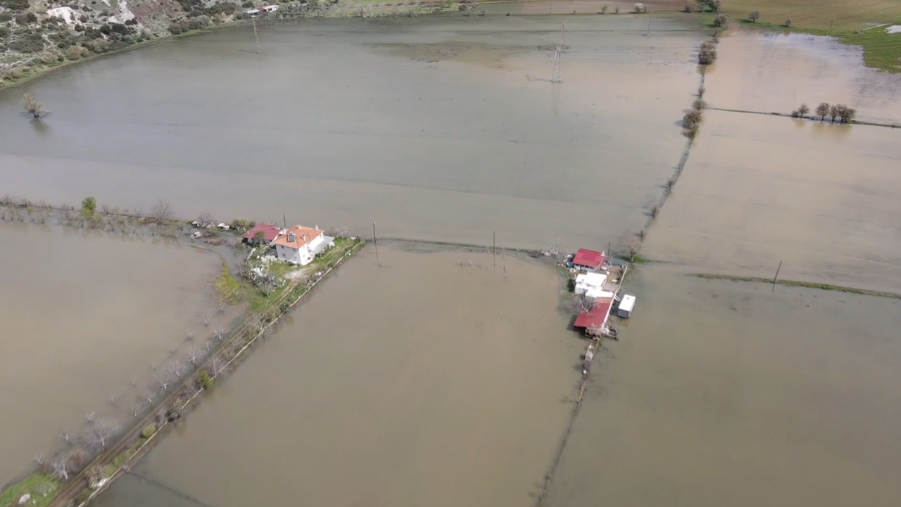 Bölgedeki su altında kalan tarım arazileri dronla kaydedildi.