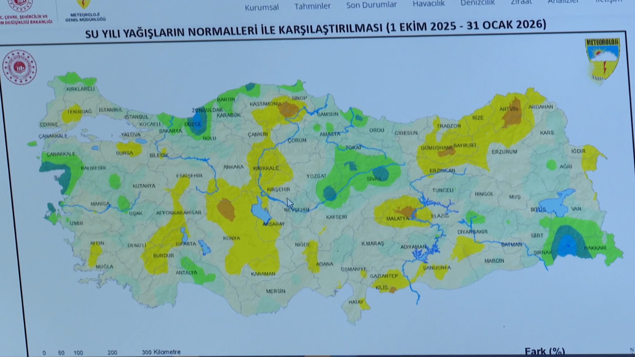 Ülkedeki 2026 su/tarım yılı 4 aylık yağışlarında uzun yıllar ortalamasına göre normali civarında, geçen yıla göre ise yüzde 38 arttı. Yağışlar bu dönemde Konya, Kastamonu, Samsun, Çorum, Malatya, Gümüşhane, Bayburt, Artvin ve Kilis çevreleri ile Sinop ve Kastamonu'nun güneyinde yer yer yüzde 40’ın üzerinde azaldı. İzmir'in batısı, Sinop ve Kastamonu'nun kuzeyi, Çanakkale, Balıkesir, Manisa, Bolu, Düzce, Zonguldak, Sivas, Kayseri, Yozgat, Şırnak, Hakkari ve Van çevrelerinde ise yer yer yüzde 40'ın üzerinde arttı.