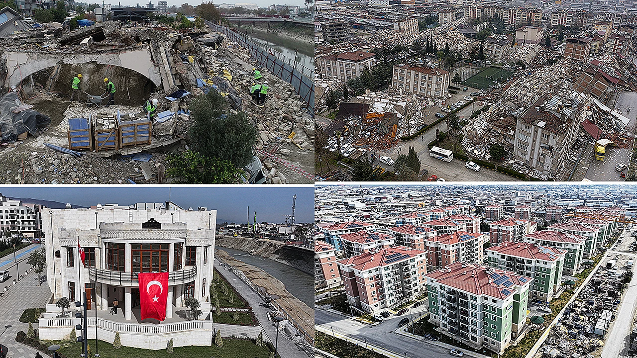 Hatay'da 6 Şubat 2023'te meydana gelen depremlerdeki yıkımın fotoğraf ve videoları ile afetin üçüncü yılında aynı açıyla havadan kayda alınan görsellerin birleşimi, şehirde inşa çalışmalarında gelinen noktayı ortaya koydu.