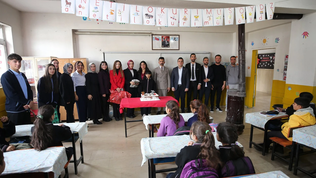 Sınıfta şarkılar eşliğinde hazırladıkları pastayı kesen öğretmen ve öğrenciler, yanlarında götürdükleri hediyeleri takdim ederek unutamayacakları anlar yaşattı.