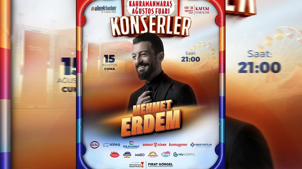 Geleneksel Ağustos Fuarı'nda 15 Ağustos Cuma günü, Türk pop müziğinin sevilen isimlerinden Mehmet Erdem sahne alarak Kahramanmaraşlılarla buluşacak. Saat 21.00'da başlayacak konserde Mehmet Erdem'in eşsiz sesiyle unutulmaz bir akşam yaşanacak.