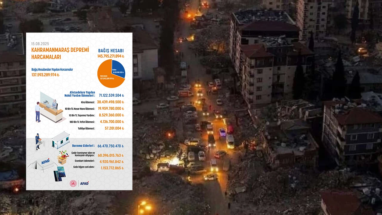 15 Ağustos 2025 itibarıyla Kahramanmaraş depremi için toplanan bağışların büyük bir kısmı afetzedelerin ihtiyaçları için kullanıldı. AFAD verilerine göre bağış hesabında toplanan 145 milyar 795 milyon 271 bin 894 TL’nin 137 milyar 593 milyon 289 bin 974 TL’si harcandı. Hesapta kalan miktar ise 8 milyar 201 milyon 981 bin 920 TL oldu.