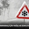 Kahramanmaraş Valiliğinden yapılan açıklamada, “09 Ocak 2026 Cuma günü Kahramanmaraş genelinde yağmur, karla karışık yağmur ve yüksek kesimlerde kar beklenmektedir. Andırın’ın güneyinde kuvvetli sağanak, 1000 metre üzeri bölgelerde kar yağışı öngörülmektedir. 10 Ocak 2026 Cumartesi ise sabah saatlerinde sıcaklıkların -5°C’ye kadar düşmesiyle il genelinde kuvvetli buzlanma ve don riski bulunmaktadır. Vatandaşlarımızın dikkatli ve tedbirli olmaları önemle rica olunur.” İfadelerine yer verildi.