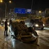 Orta refüjde bulunan aydınlatma direğine çarpan araç, devrildi.