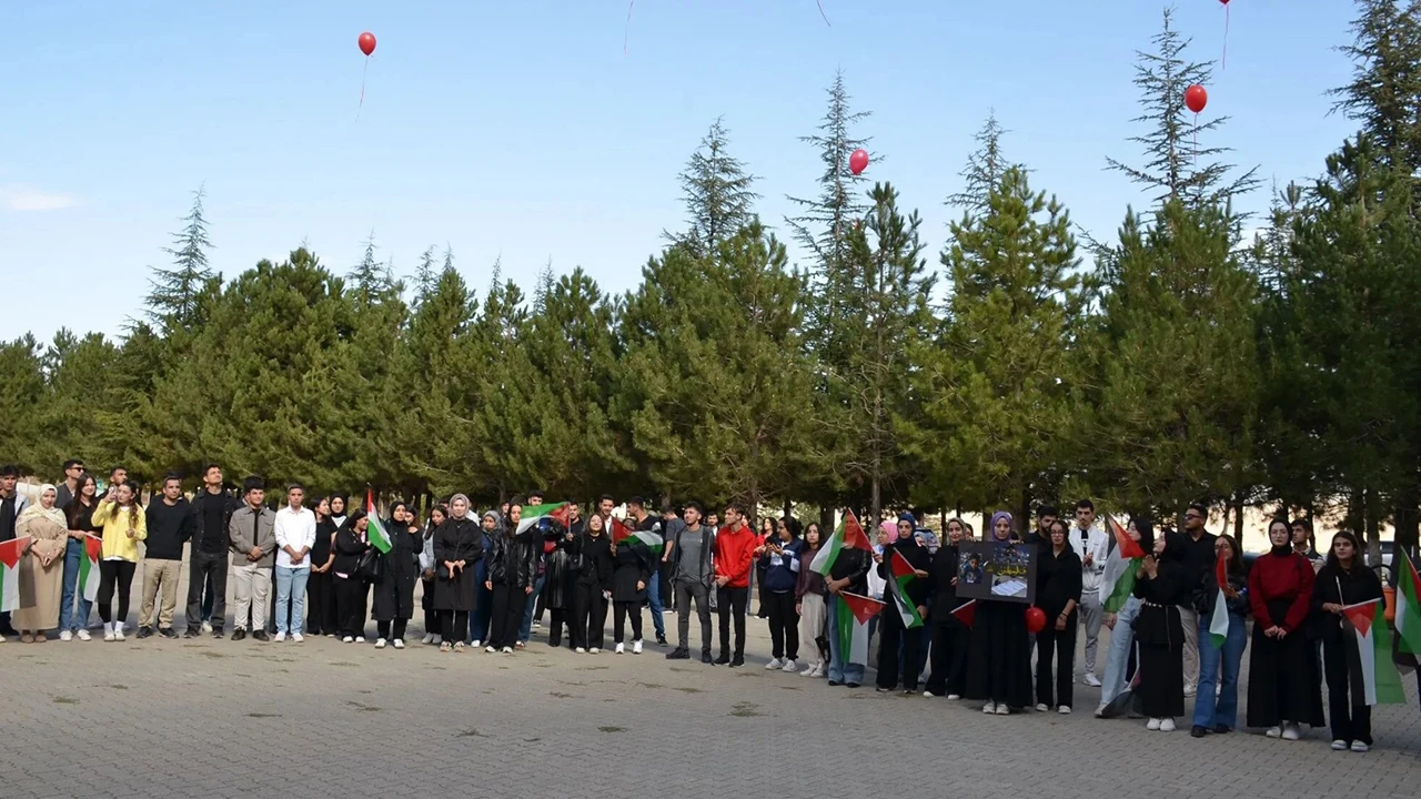 Etkinlikte öğrenciler, mazlum coğrafyalarda yaşanan acılara dikkat çekmek amacıyla sembolik bir tiyatro gösterisi sergiledi. Program, barışı ve umudu simgeleyen balonların gökyüzüne bırakılmasıyla sona erdi.