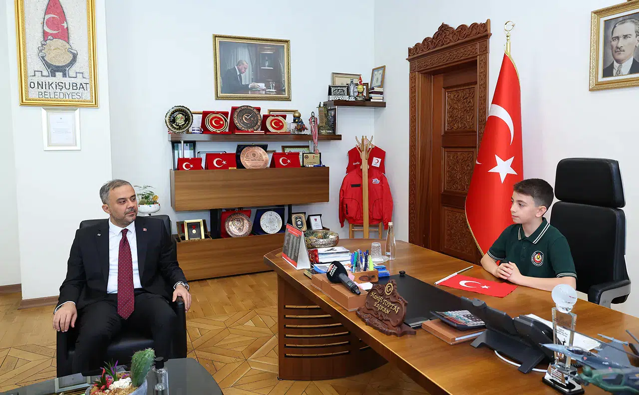 Onikişubat Belediye Başkanı Hanifi Toptaş, makam koltuğunu Şehit Ahmet Gülbahar Ortaokulu 5’nci sınıf öğrencisi Halil Sami Kulotu’ya devretti.