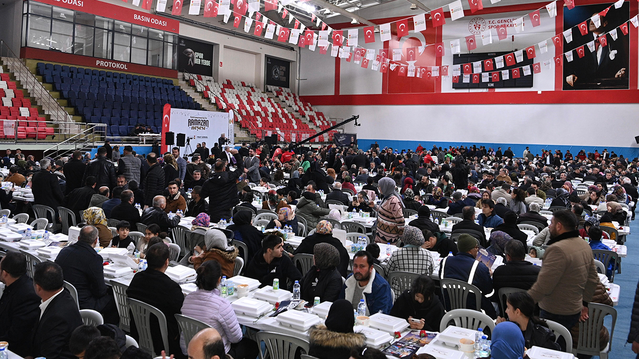 İlçe Spor Salonu’nda gerçekleştirilen iftar programı, Ramazan ayının ruhuna yakışır şekilde birlik, beraberlik ve kardeşlik duygularının yoğun şekilde hissedildiği anlamlı bir buluşmaya sahne oldu. İlçe halkının büyük ilgi gösterdiği programda salon tamamen dolarken, 7’den 70’e her yaştan vatandaş aynı sofrada bir araya gelerek Ramazan’ın bereketini ve paylaşmanın huzurunu birlikte yaşadı. İlçede adeta gönül sofralarının kurulduğu programda, iftar saatinin yaklaşmasıyla birlikte edilen dualar ve okunan ezan eşliğinde oruçlar açıldı. Vatandaşlar Ramazan ayının manevi iklimini hep birlikte yaşarken, dayanışma ve paylaşmanın en güzel örneklerinden biri sergilendi.
