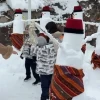 Sezer, 7 kişilik kardan folklor ekibinin başına fes taktı, bellerine ise kuşak bağladı.