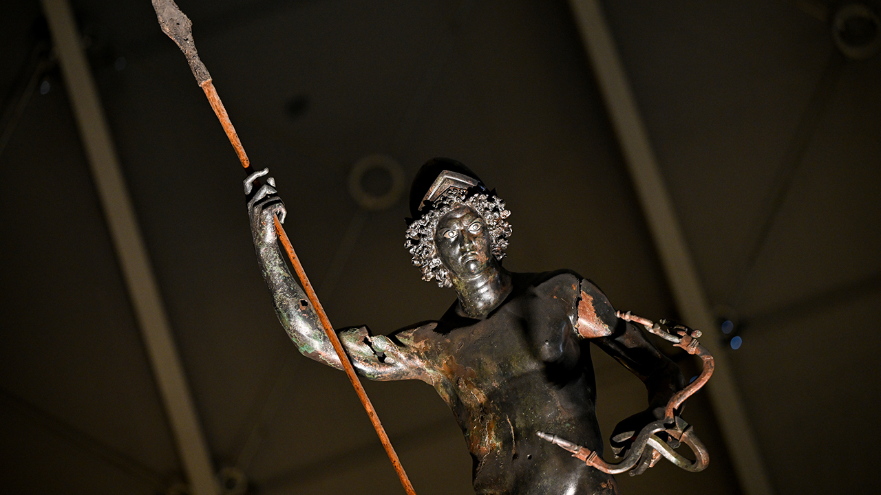 Savaşçı genç bir erkeği betimleyen heykelin özellikle bakışları dikkati çekiyor. Miğferli figürün ortadan ayrılan kıvırcık ve kabarık saçları alın ve yüzünü çevreleyerek ensesine kadar uzanıyor. Göz bebekleri altın ve gümüş kakmalı olan heykelin yüz ifadesinde öfke ve kararlılık öne çıkıyor.
