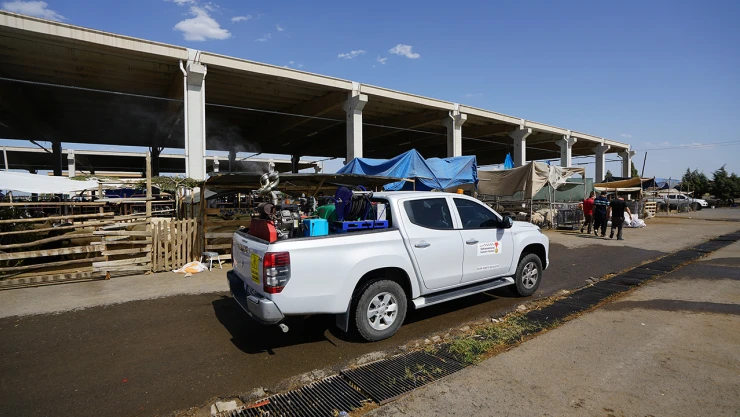 Çevre Koruma ve Kontrol Dairesi Başkanlığı koordinesindeki ekiplerce gerçekleştirilen çalışmalarla Canlı Hayvan Borsası’nda padoklar, bekleme noktaları, kesim üniteleri ve ortak kullanım alanları dezenfekte edildi.