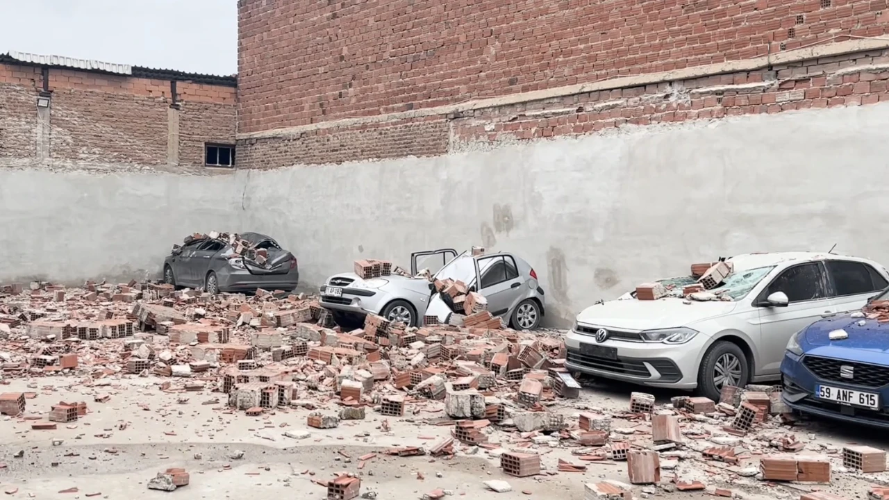 Eskişehir'de kuvvetli rüzgar nedeniyle metruk binanın çatı duvarının devrilmesi sonucu park halindeki 6 araçta hasar oluştu.