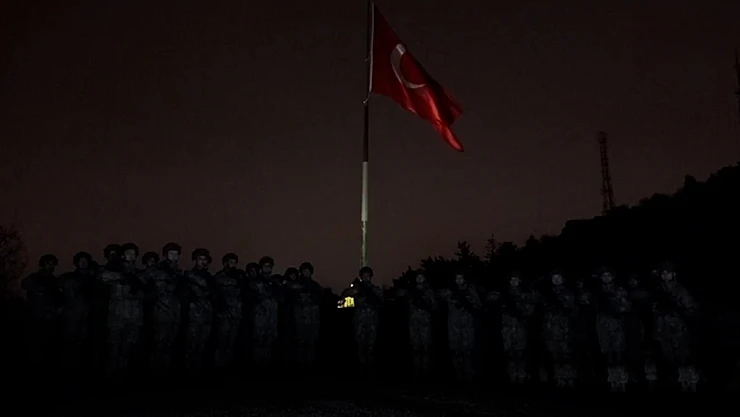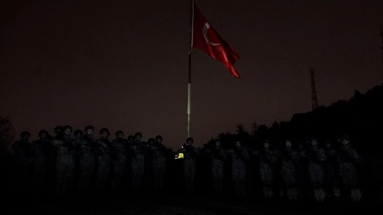 Paylaşımda, görev başındaki Mehmetçiğin depremin gerçekleştiği dakikalarda Türk bayrağının altında saygı duruşunda bulunduğu görüntülere de yer verildi.