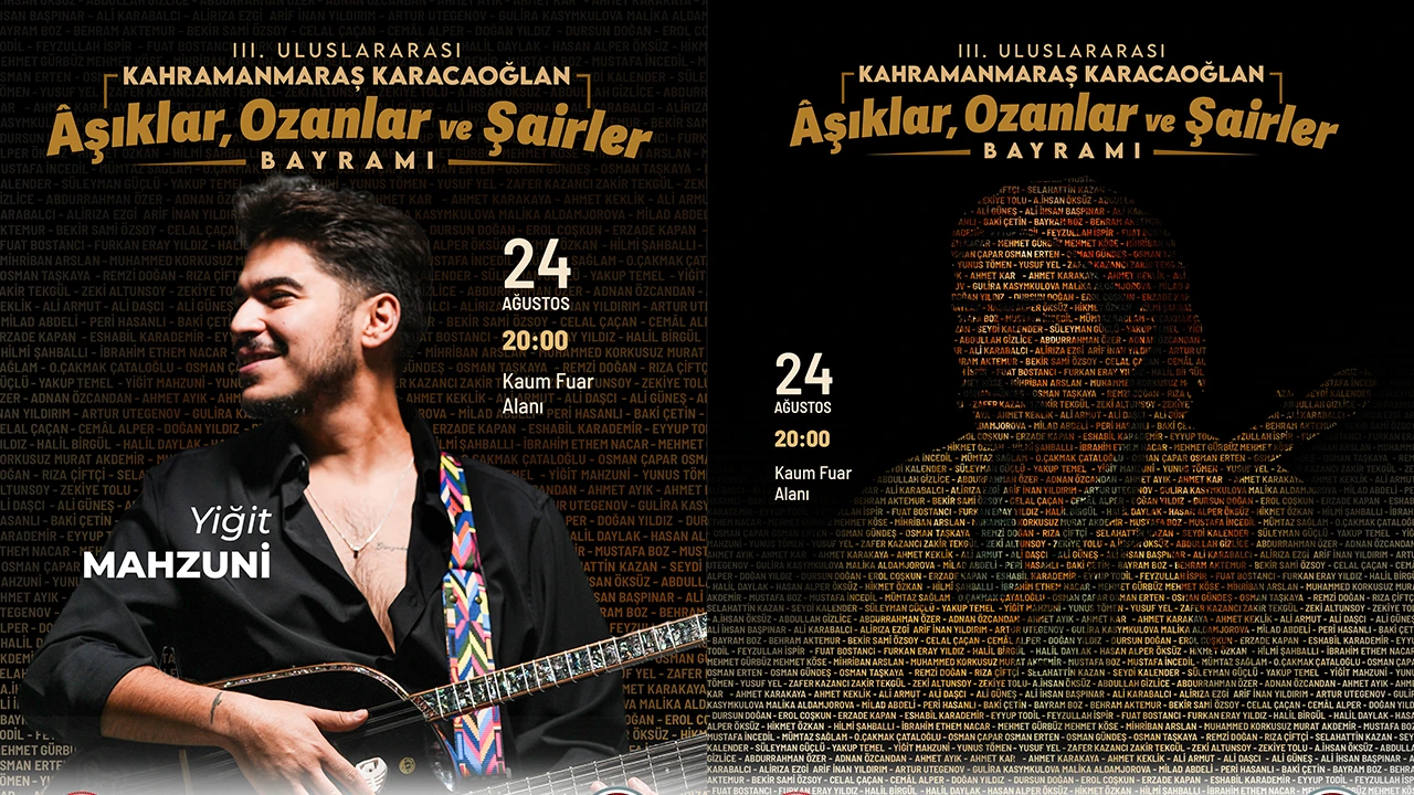 Geleneksel Ağustos Fuarı'nda 24 Ağustos Pazar günü 3'üncü Uluslararası Kahramanmaraş Karacaoğlan Âşıklar, Ozanlar ve Şairler Bayramı programı gerçekleştirilecek. Türk halk edebiyatının ve kültürünün önemli bir mirası olan bu geleneğin yeni kuşaklara aktarılmasına da katkı sağlayacak olan etkinlik, izleyenlere hem duygu dolu hem de keyifli anlar yaşatacak.