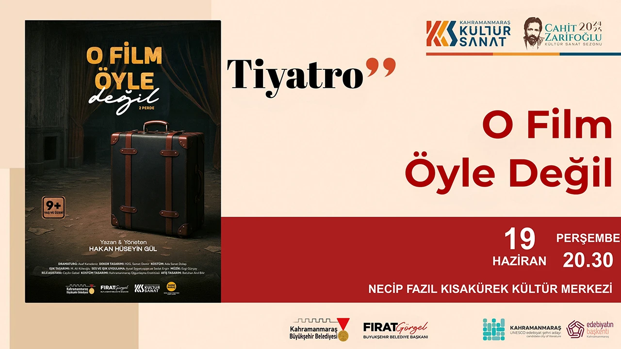 Sahne Maraş Tiyatro Okulu’nun usta eğitmenleri ve yetenekli oyuncuları tarafından sahnelenen “O Film Öyle Değil” adlı yetişkin tiyatro oyunu, 19 Haziran Perşembe günü saat 20.30’da Necip Fazıl Kısakürek Kültür Merkezi’nde izleyiciyle buluşacak.