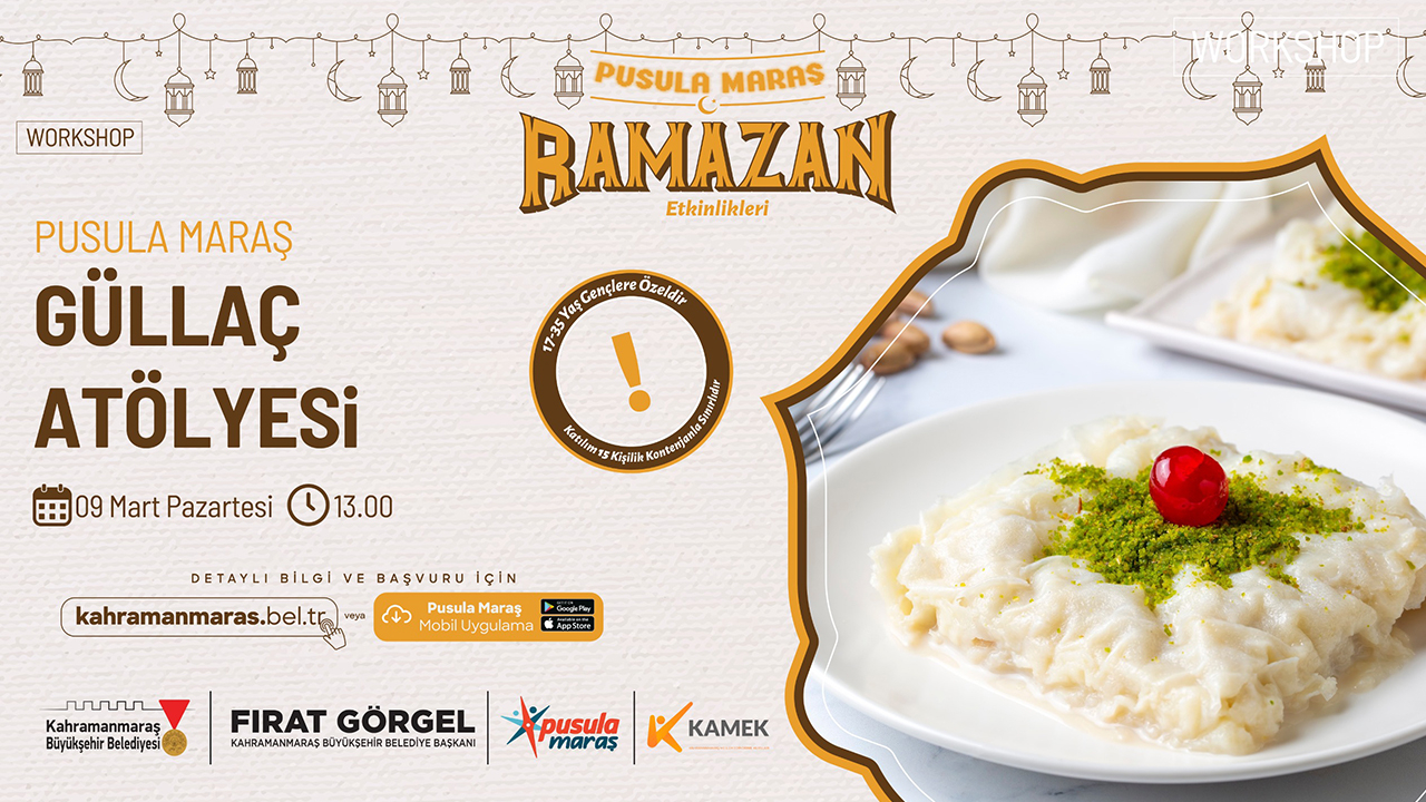 Gençlerin hem kültürel mirasla tanışmasını hem de sosyal etkinlikler aracılığıyla bir araya gelmesini amaçlayan Pusula Maraş, “Güllaç Yapım Atölyesi” ile katılımcılara keyifli ve öğretici bir deneyim sunacak. Ramazan sofralarının vazgeçilmez tatlılarından biri olan güllacın yapım aşamalarının uygulamalı olarak anlatılacağı etkinlik 9 Mart Pazartesi günü saat 13.00’da KAMEK binasında gerçekleştirilecek. Etkinlikte yaklaşık 600 yıllık bir geçmişe sahip güllaç tatlısının doğru yapım teknikleri hakkında bilgiler verilecek.