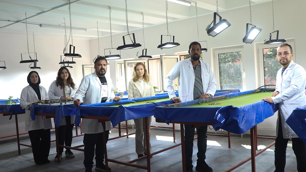 Erciyes Üniversitesinde (ERÜ) su mercimeğiyle beslenen Japon balıklarının gübresi topraksız tarımda kullanılıyor.