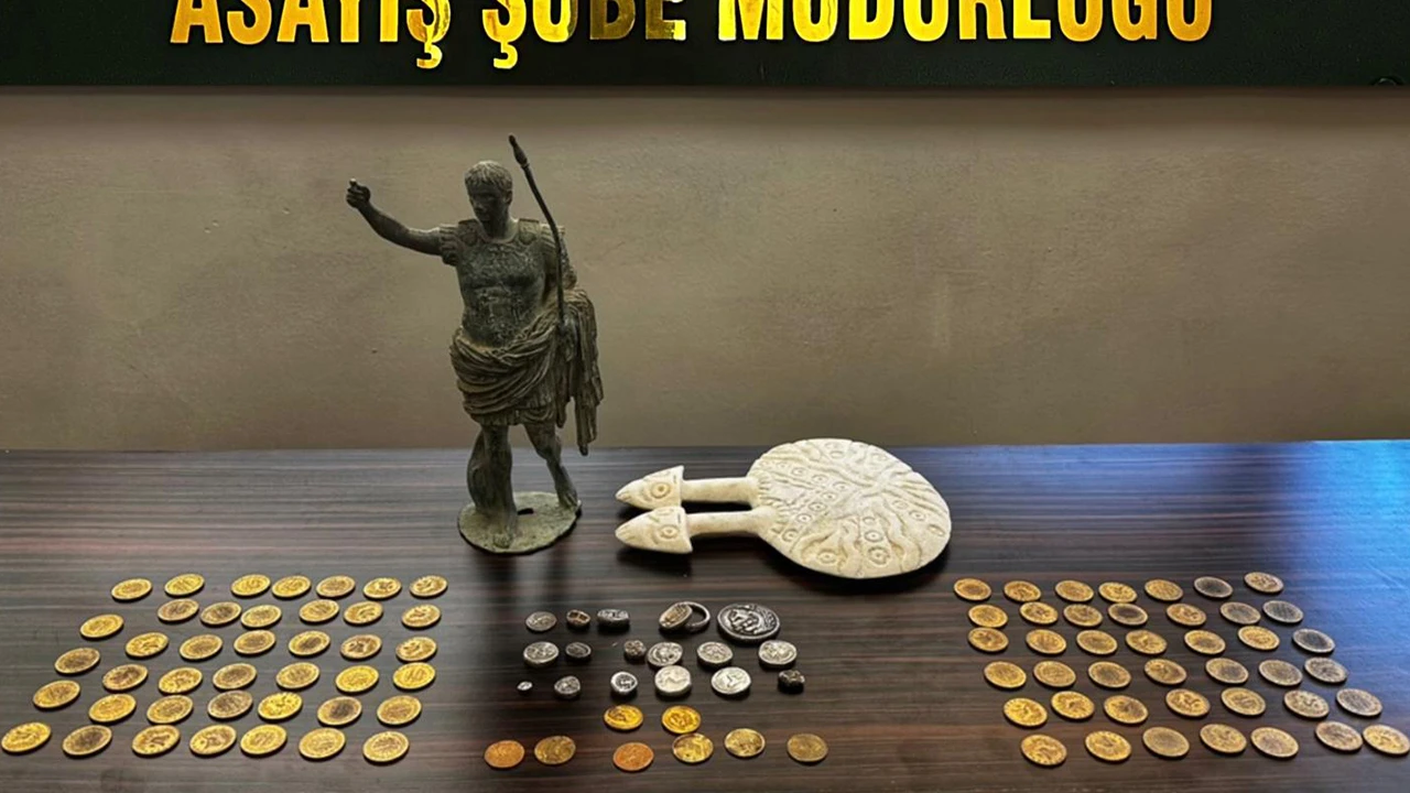 Belirlenen adreslerde yapılan aramalarda bulunan 2 heykel, 108 sikke, cep telefonu, sim kartlar ve bir araca el konulurken 4 şüpheli gözaltına alındı.