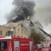 Binadaki çalışanları tahliye eden itfaiye ekiplerinin yangına müdahalesi sürüyor.