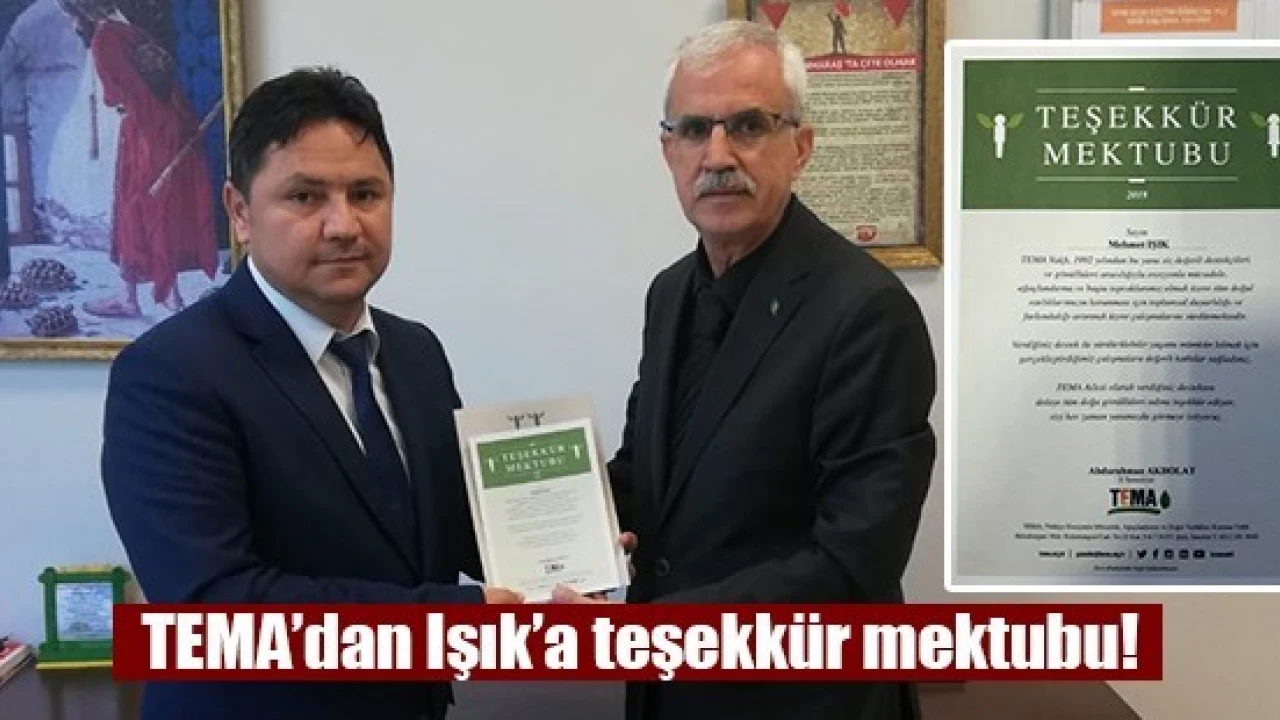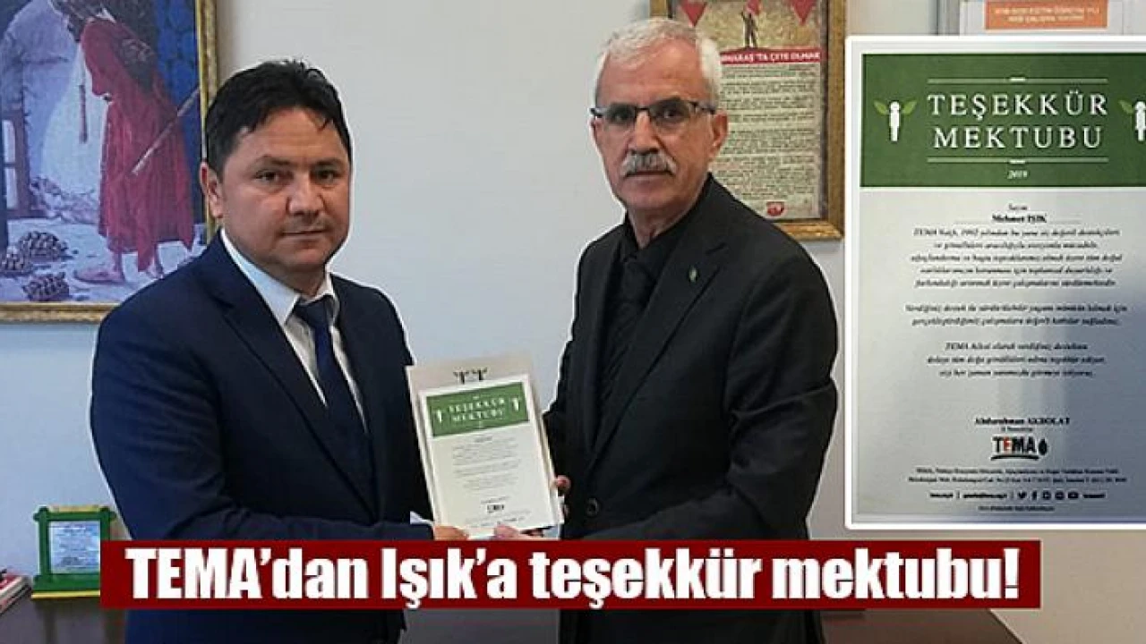 Türkiye Erozyonla Mücadele Ağaçlandırma ve Doğal Varlıkları Koruma Vakfı (TEMA) tarafından Tarihçi Yazar Mehmet Işık'a teşekkür mektubu gönderildi. Mektubu, TEMA Kahramanmaraş İl Temsilcisi Abdurrahman Akbolat takdim etti.