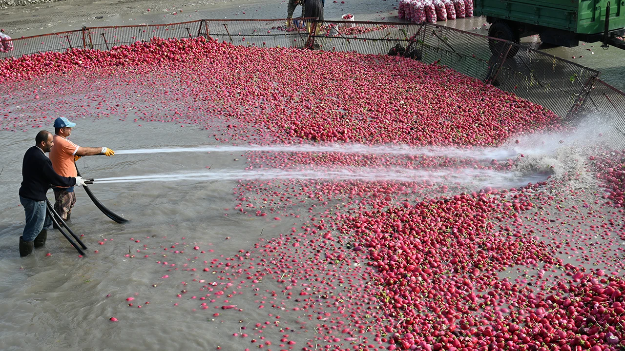 Osmaniye'de coğrafi işaret tescilli Kadirli turpunda hasada başlayan çiftçiler, tüketicilere ulaştıracakları ürünleri çamurdan arındırmak için Savrun Çayı'nın soğuk suyunda el birliğiyle çalışıyor.