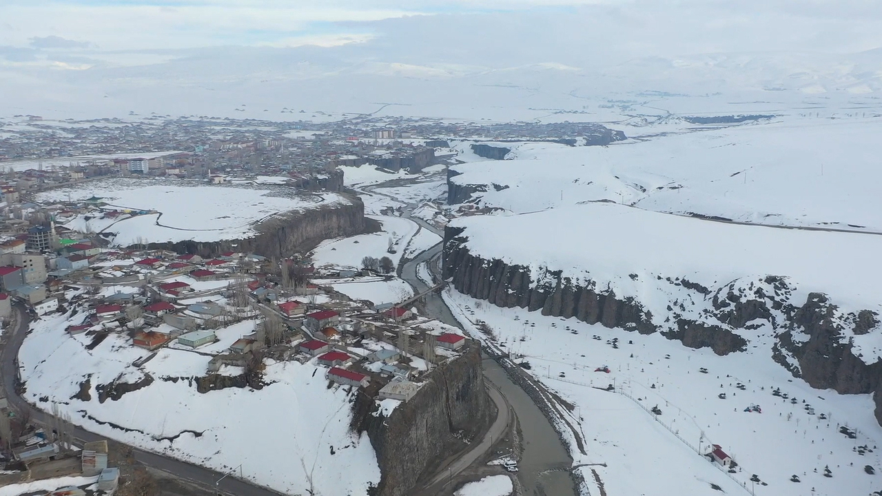 Sarp kayalıklar ve kayalıkların üzerinde evlerin bulunduğu kanyon, hem gece hem de gündüz dronla kayıt altına alındı.