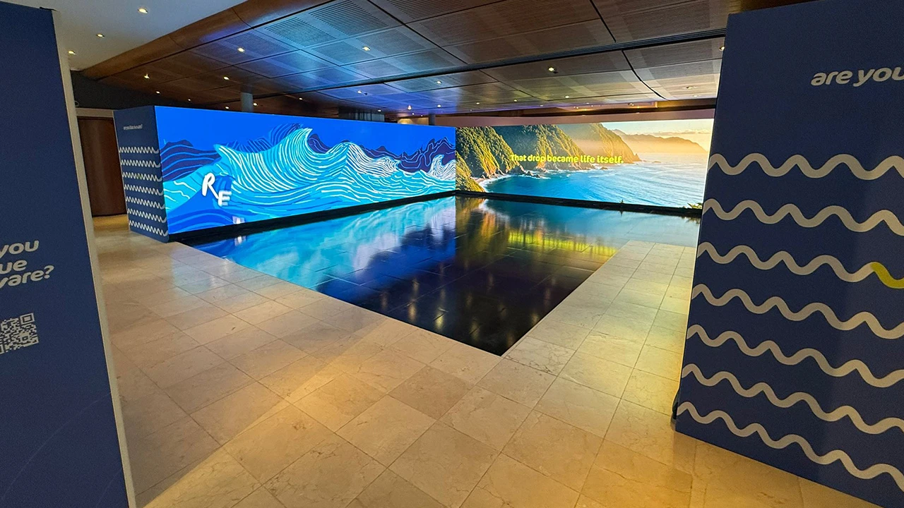 Serginin girişinde ‘Buzul Tüneli’ ile küresel iklim değişikliğinin etkilerine dikkat çekildi. ‘Are You Blue Aware – Mavinin Farkında Mısın’ alanı ile deniz kirliliğini Sıfır Atık bilinciyle önlemeyi hatırlatan içerikler sunuldu. Tek kullanımlık atıkların mavi yaşamı nasıl tehdit ettiği sergilenen eserlerle hatırlatıldı. Sergide Ali Saran’ın ‘Sound of Water’ adlı eseri, rebab, kanun, ney, ud ve vurmalılarla icra edildi. ‘Su Medeniyeti’ bölümünde Mimar Sinan’ın su kemerleri, Fuzuli’nin Su Kasidesi, Türk hamam kültürü, çeşme kitabeleri ve Ayazma geleneği örneklerle sunuldu.
