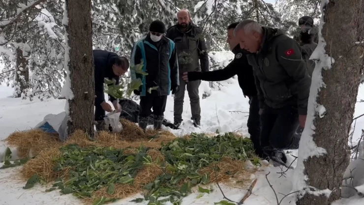 Yaban hayvanları için karlı kaplı alanlara yem bırakıldı