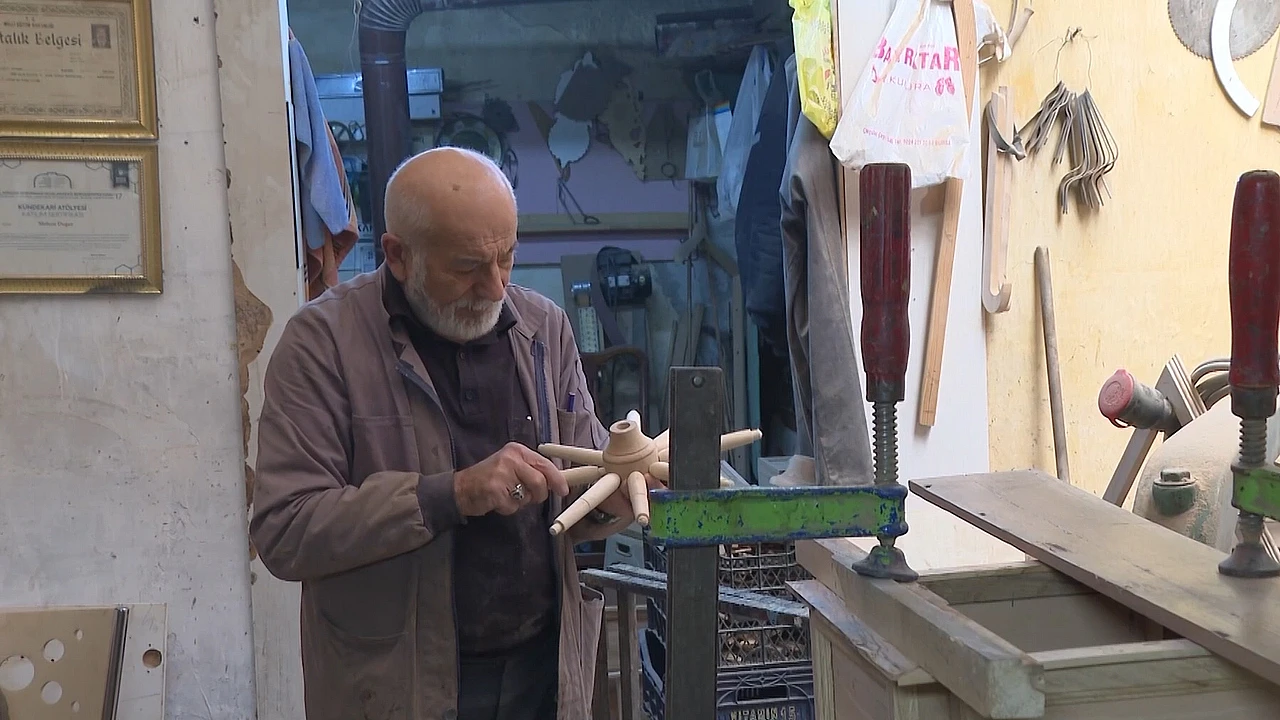 Bursa'da yaşayan ahşap el sanatları ustası Muhsin Duğan, ömrünün 53 yılını adadığı mesleğini Tarihi Kayhan Çarşısı'ndaki dükkanında sürdürüyor.