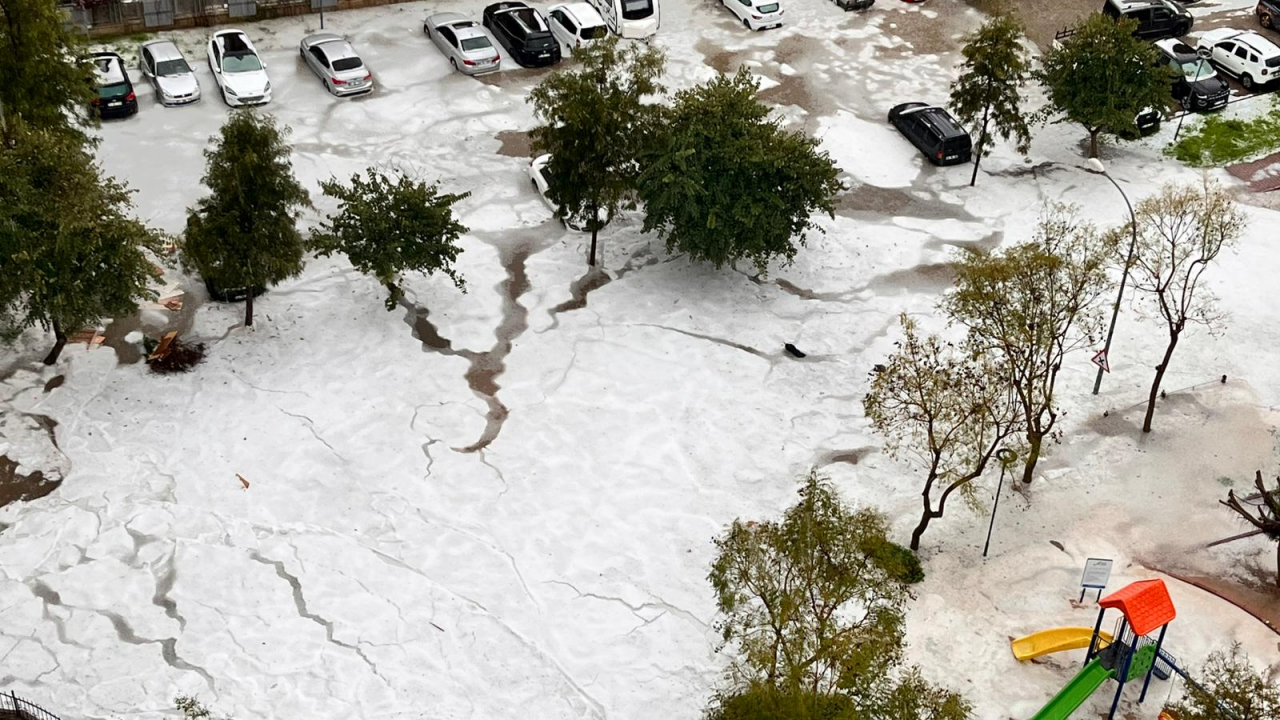 Aynı bölgede birçok sokağın birleştiği eğimli yolda yaklaşık yarım metrenin üzerinde dolu birikintisi oluştu.
