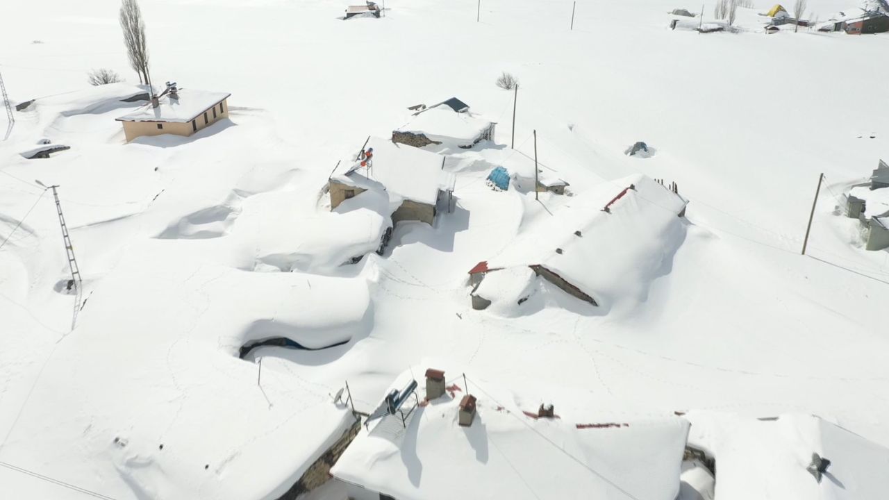 Bölgede son günlerde etkili olan yoğun karın ardından köylerdeki tek katlı ev ve ahırlar adeta kara gömüldü. Baharda kışın yaşandığı, ev ve ahırların kardan kaybolduğu köyler, AA ekibince dronla görüntülendi.