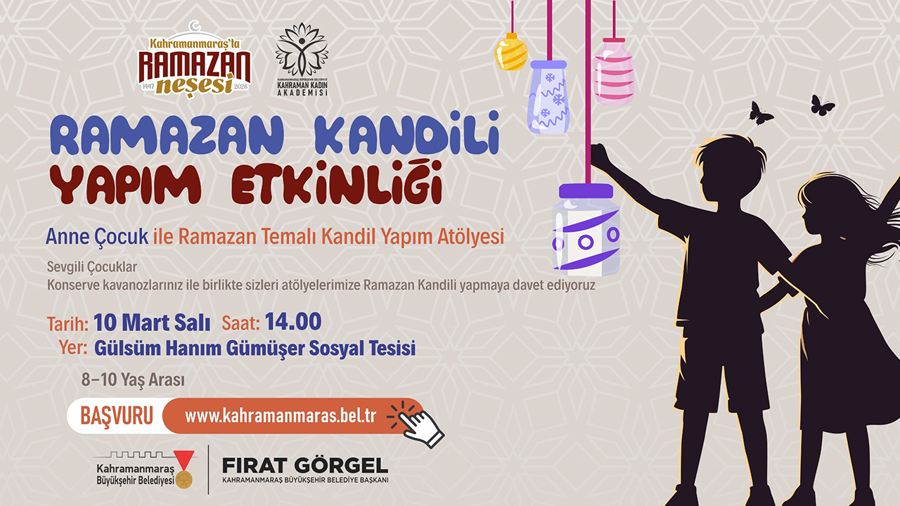 Sınırlı kontenjanla gerçekleştirilecek etkinliğe katılmak isteyen anne ve çocuklar için başvurular çevrimiçi olarak alınıyor. Programa katılmak isteyen vatandaşlar, https://kahramanmaras.bel.tr/duyuru/2026/03/07/anne-cocuk-ramazan-kandili-yapim-atolyesi-basvuru-formu internet adresinden başvuru formunu doldurarak kayıt yaptırabiliyor.