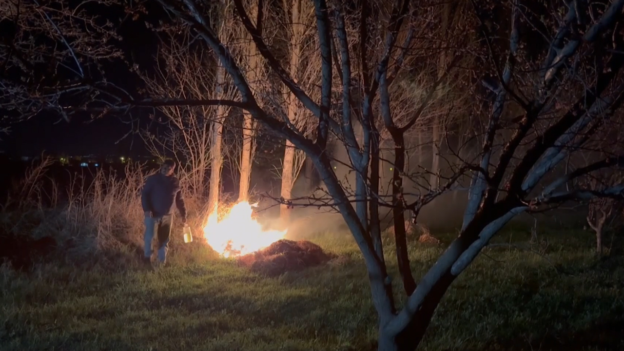 Bahçede nöbet tuttuklarını belirten Yıldırım, "Dağlarda kar var, rüzgar sert esiyor. Bahçemizi ve meyvemizi dondan korumak için ateş yaktık. Hem ot balyası hem de hayvan gübresi var. Gündüzden hazırlığımızı yaptık." dedi.