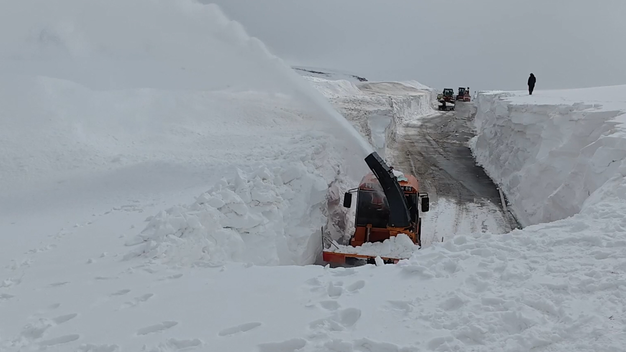Rotatif araç, kepçe ve greyderle zorlu bir çalışma yürüten ekipler, yer yer 5 metreyi aşan karla mücadele etti.
