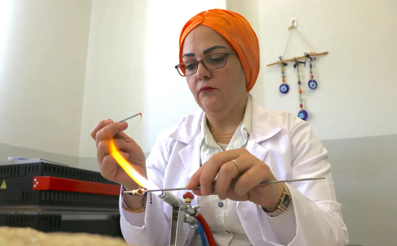 İstanbul'dan temin ettiği camları yüksek ısıda eriterek boncuklara dönüştüren Kazak, bileklikten kolyeye, anahtarlıktan dekoratif objelere kadar birçok ürün tasarlıyor.