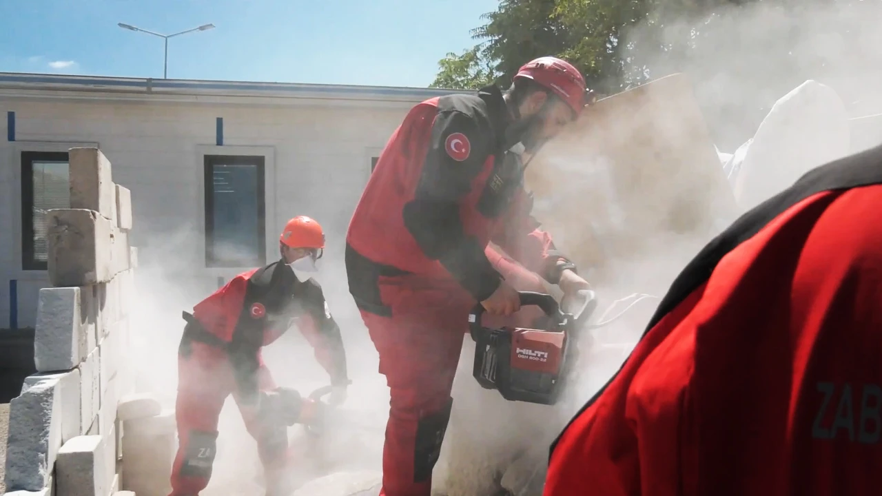 Deprem, sel, yangın gibi afetlerde görev alabilecek donanıma sahip ekip tarafından gerçekleştirilen tatbikatta, senaryo gereği bir deprem sonrası yıkılan binanın enkazında kalan yaralı vatandaş kurtarıldı.